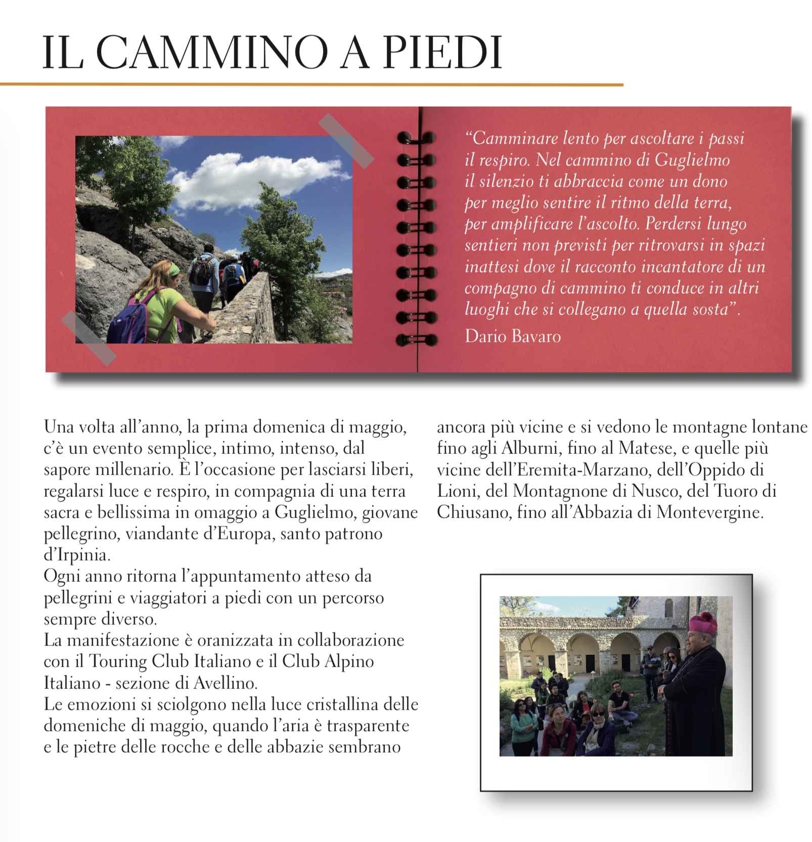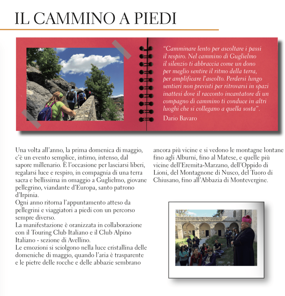 Nel programma definitivo, che a breve sarà pubblicato sul sito web camminodiguglielmo.it, la traccia ufficiale ‘a piedi’ sarà accompagnata da questa precisazione: “si consiglia di prenotare una guida esperta (*) per essere accompagnati nel primo tratto, almeno fino alla località ‘Pozzo di S. Guglielmo’, tratto che richiede circa 2,5 ore di cammino”; saranno forniti i recapiti delle guide abilitate (*) e delle associazioni che aderiscono al Cammino. Sarà pubblicata altresì una traccia più facile, dedicata in particolare alle e-bike.