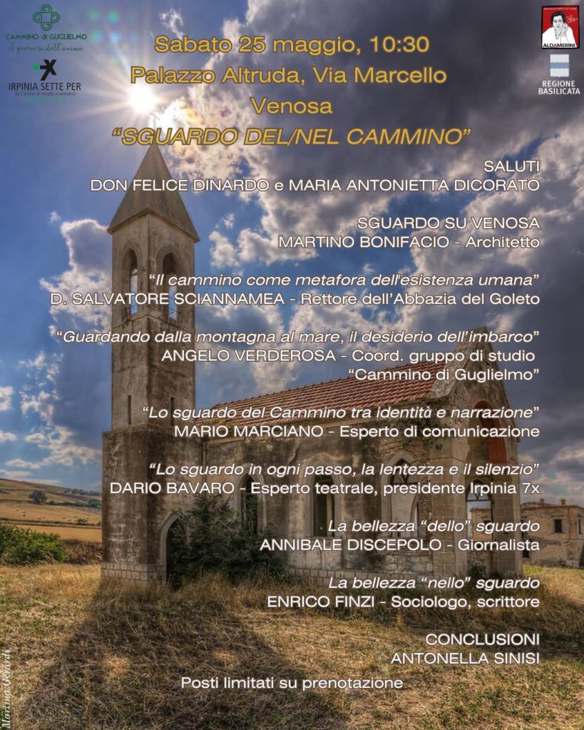 Convegno “Sguardo del/nel Cammino”, organizzato dall’Ass.ne Anti Stigma Alda Merini onlus a Venosa. Introduce: Maria Antonietta di Corato; relazionano: Martino Bonifacio, D. Salvatore Sciannamea, Angelo Verderosa, Mario Marciano, Dario Bavaro, Annibale Discepolo, Enrico Finzi; conclude Antonella Sinisi.