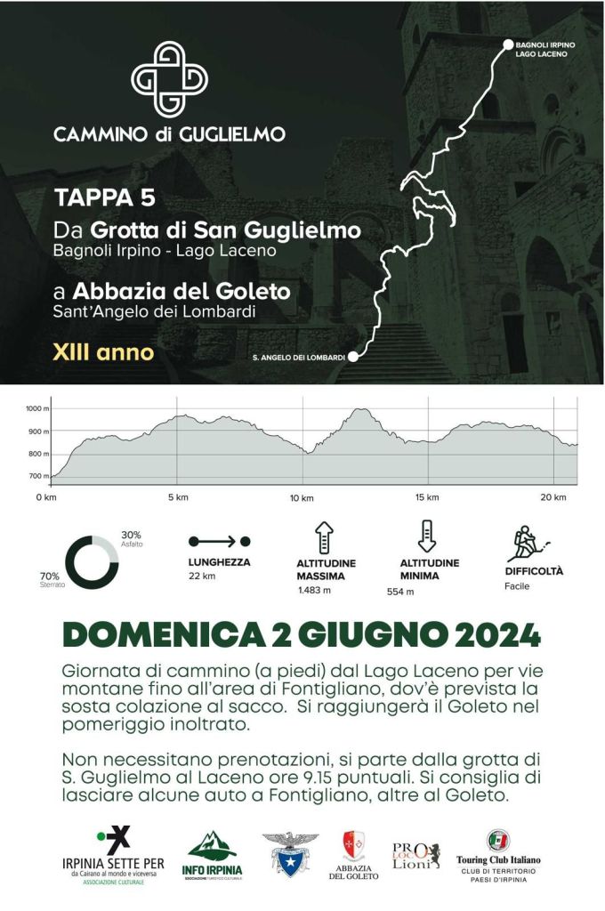Domenica 2 giugno 2024, giornata di cammino (a piedi) dalla Grotta dell’Apparizione sul Lago Laceno (Bagnoli Irpino) per vie montane fino alla badia di Fontigliano (Nusco), dove, nell’area attrezzata, è prevista la sosta per la colazione al sacco; si raggiungerà (compatibilmente con situazione meteo) l’Abbazia del Goleto nel pomeriggio inoltrato. Percorreremo questo tratto ‘fondativo’ del Cammino per il 13° anno consecutivo !