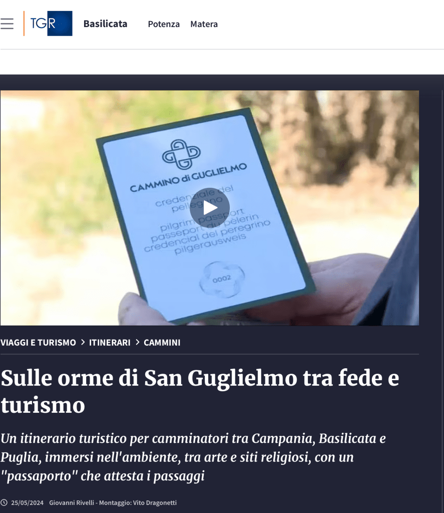 La redazione TGR Basilicata, in occasione della TRE GIORNI del Cammino, da Montevergine a Barletta (23-24 e 25 maggio 2024) ha dedicato al ‘CAMMINO DI GUGLIELMO’ un approfondito e utile servizio televisivo. Ringraziamo per la cura il giornalista Giovanni Rivelli; per l’ospitalità ‘Hostel Il Tetto’ di Melfi con Liberato Canadà e Marida Sonnessa.