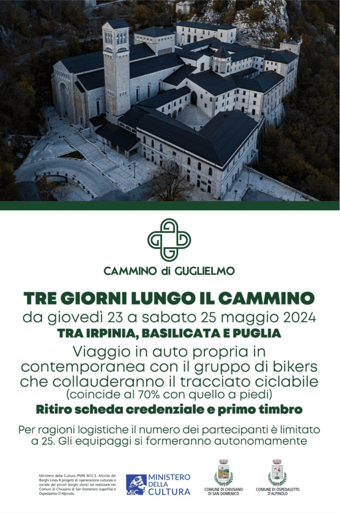 Conto alla rovescia per il taglio del nastro del Cammino di Guglielmo, progetto finanziato dal PNRR dal Ministero della Cultura ai Comuni di Chiusano di San Domenico (capofila) e Ospedaletto d’Alpinolo, e che si rifà al viaggio e pellegrinaggio del giovane Guglielmo partito da Vercelli nel Medioevo, seguendo la via Appia e deciso ad imbarcarsi per raggiungere la Terra Santa.