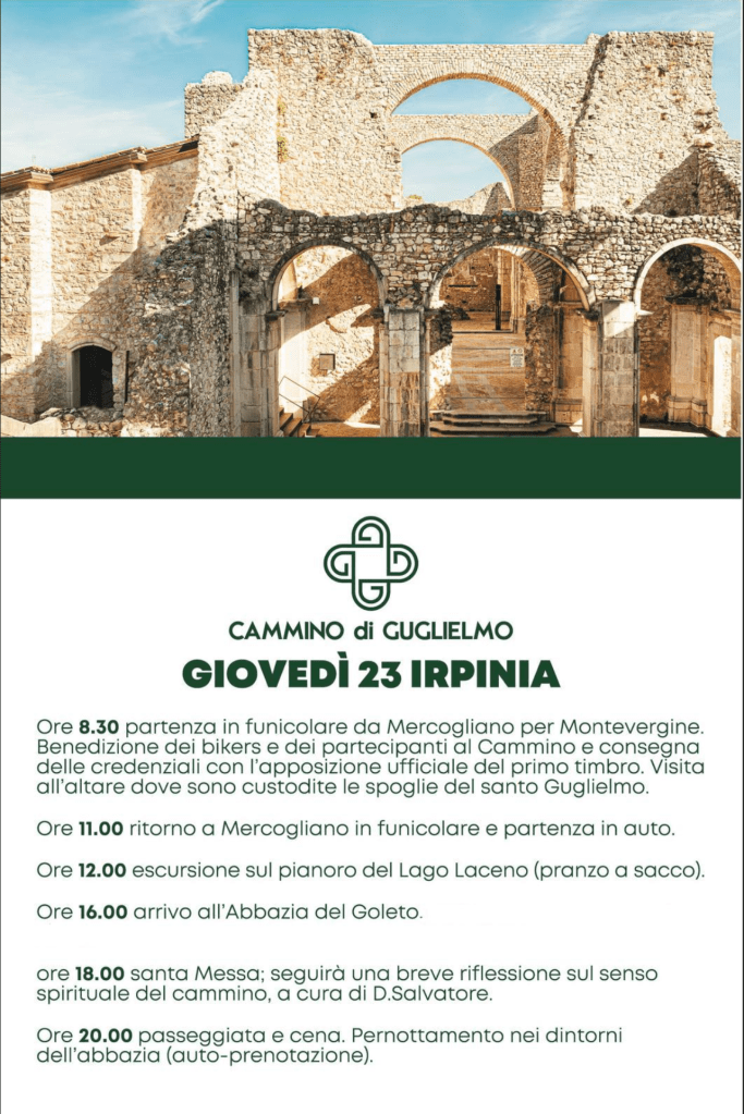 Benedizione dei bikers e dei partecipanti al Cammino e consegna delle credenziali con l’apposizione ufficiale del primo timbro. Visita all’altare dove sono custodite le spoglie del santo Guglielmo. ore 11.00 ritorno a Mercogliano in funicolare e partenza in auto. ore 12.00 escursione sul pianoro del Lago Laceno (pranzo a sacco). Ore 16.00 arrivo all’Abbazia del Goleto; ore 18 santa Messa; seguirà una breve riflessione sul senso spirituale del cammino, a cura di D.Salvatore. ore 20.00 passeggiata e cena. Pernottamento nei dintorni dell’abbazia (auto-prenotazione).