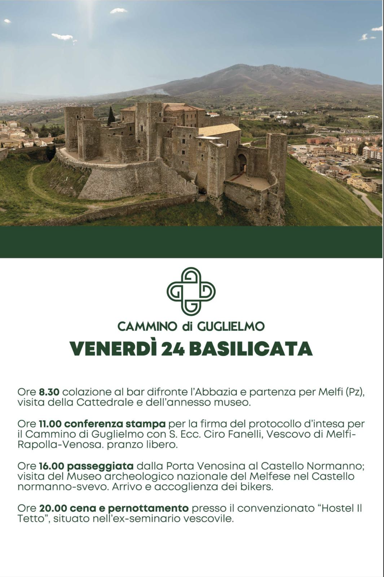 ore 8.30 colazione al bar difronte l’Abbazia e partenza per Melfi (Pz), visita della Cattedrale e dell’annesso museo. Ore 11.00 conferenza stampa per la firma del protocollo d’intesa per il Cammino di Guglielmo con S. Ecc. Ciro Fanelli, Vescovo di Melfi-Rapolla-Venosa.