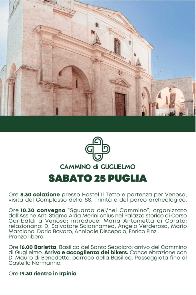 L’indomani, partenza per Melfi per la stipula del protocollo d’intesa con il Vescovo di Melfi-Rapolla e Venosa, S.Ecc. Ciro Fanelli, e per raggiungere, sabato, Venosa dove si terrà un importante convegno dedicato al senso del cammino e infine l’arrivo a Barletta alla Basilica del Santo Sepolcro. I bikers collauderanno il 70% del tracciato previsto a piedi -, utilizzeranno bici elettriche e riceveranno i timbri delle credenziali ad ogni sosta.