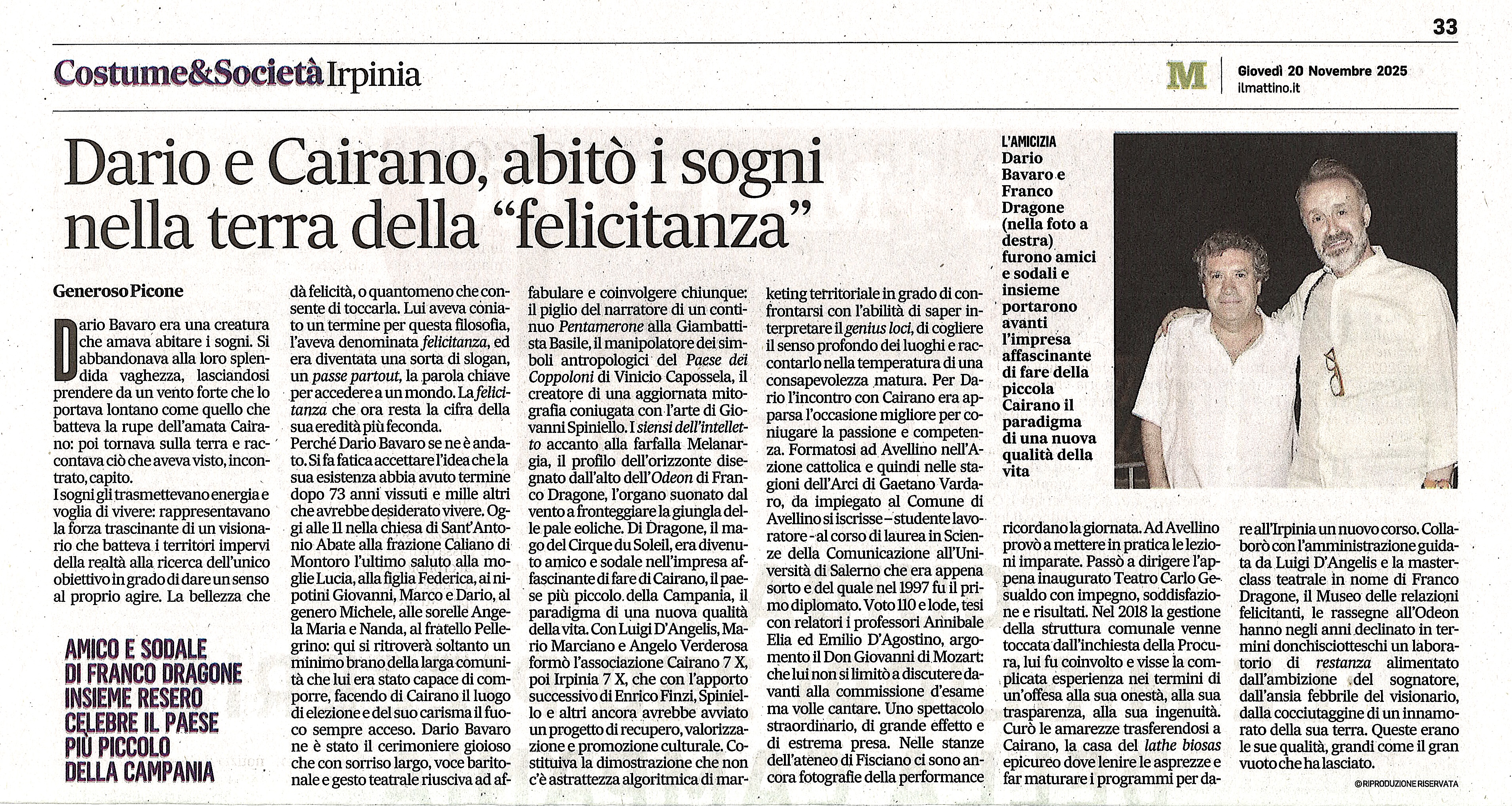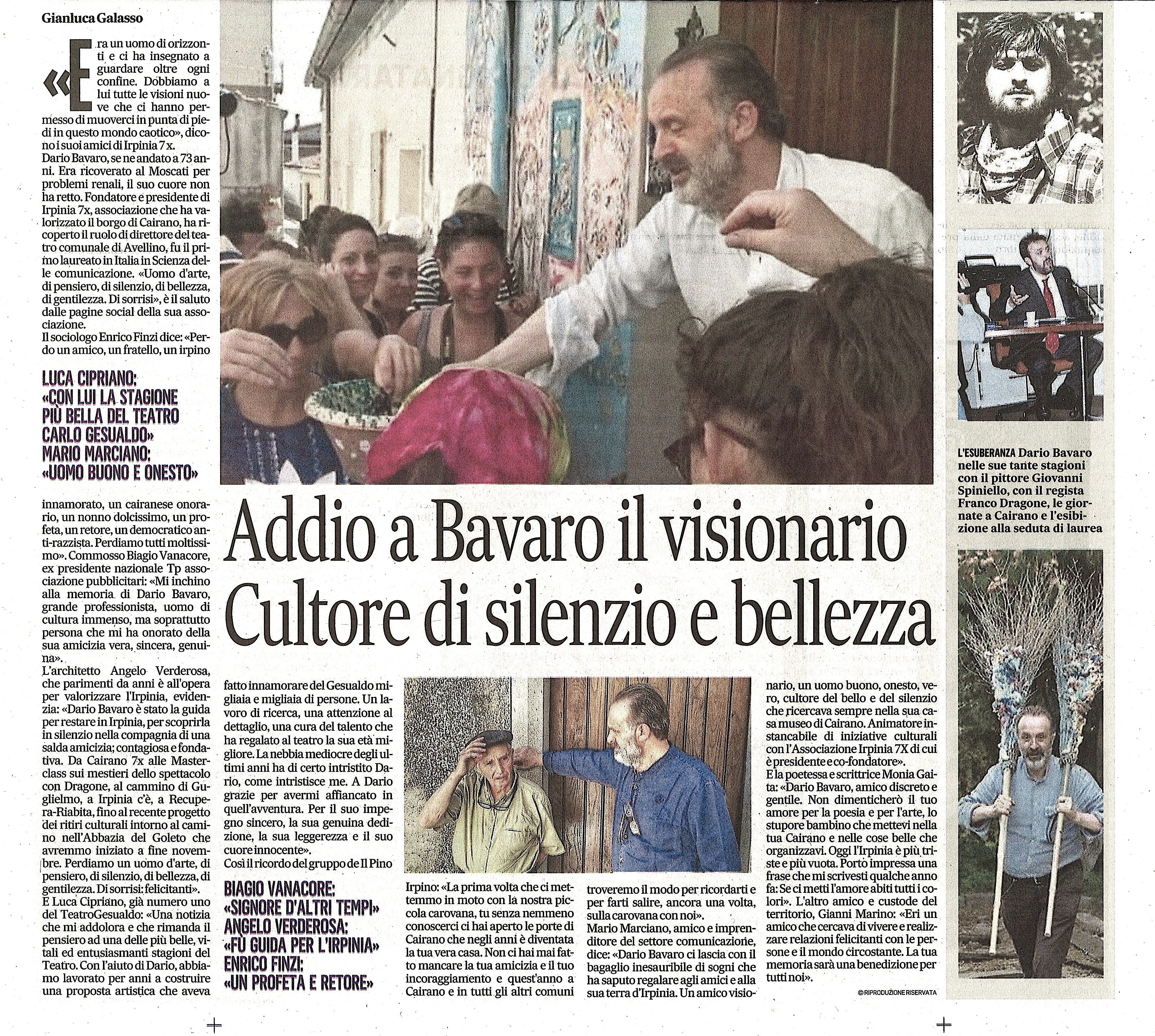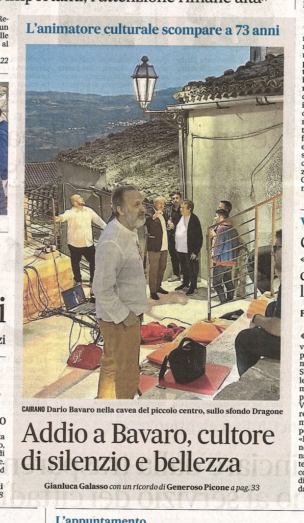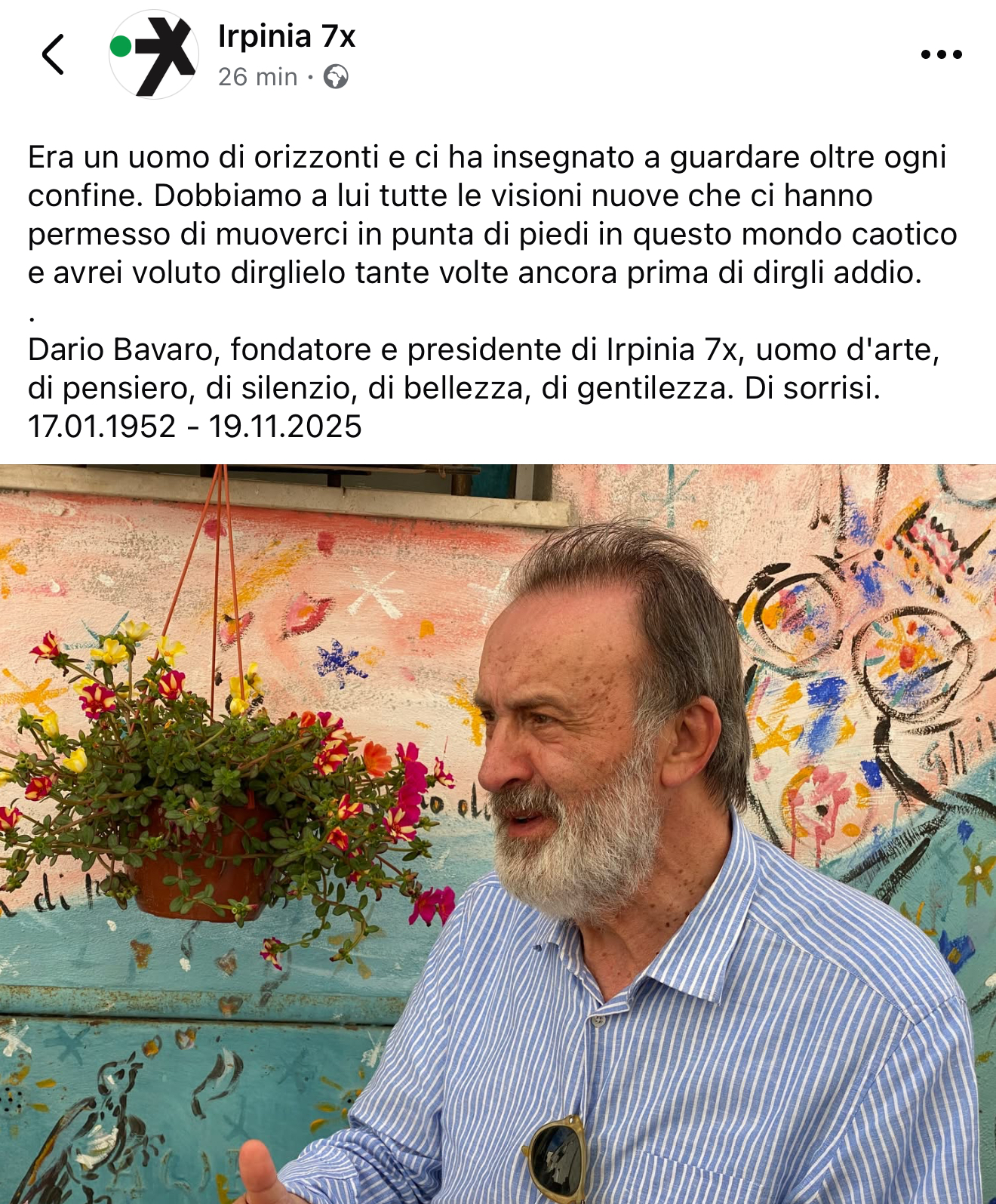 Dario Bavaro è stato la migliore guida per restare in Irpinia, per conoscerla in silenzio nella compagnia di una salda amicizia; contagiosa e fondativa. Da Cairano 7x alle Masterclass sui mestieri dello spettacolo con Dragone, al Cammino di Guglielmo, a Irpinia c’è, a Recupera-Riabita, fino al recente progetto dei ritiri culturali intorno al ‘camino’ nell’Abbazia del Goleto che avremmo iniziato a fine novembre. Perdiamo un uomo d’arte, di pensiero, di silenzio, di bellezza, di gentilezza. Di sorrisi: felicitanti. _Angelo Verderosa