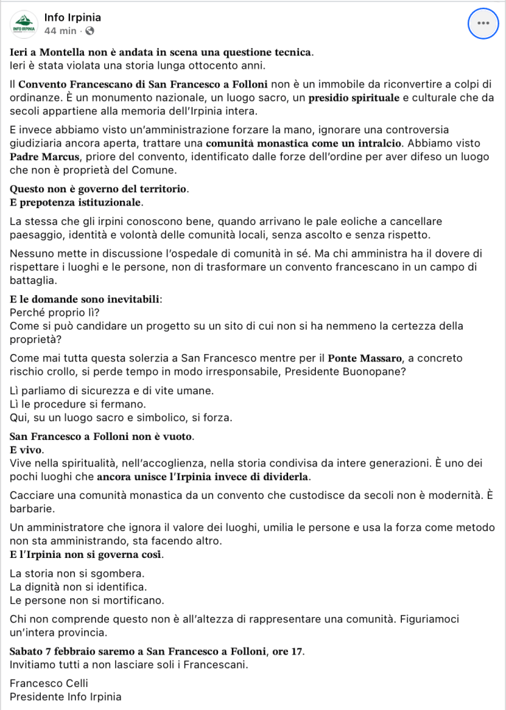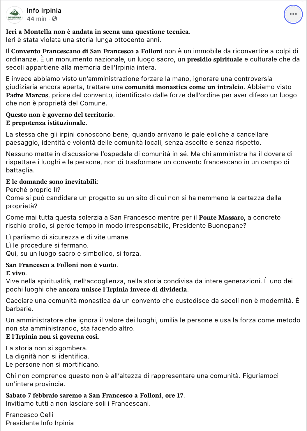 Amiamo la nostra Irpinia e siamo interessati a discutere sul ‘che fare’ ma siamo altresì convinti che nell’immediato non si deve toccare il luogo religioso che -ricordiamo- è monumento nazionale; il progetto di ospedale venga spostato altrove: ci sono tanti altri posti. E siamo ancora convinti che in questa contingenza è necessario ‘ricominciare da 3’: Folloni (con San Francesco), Goleto (con San Guglielmo) e la ferrovia Rocchetta-Avellino (con noi tutti che vogliamo essere cittadini serviti da mezzi di trasporto pubblico, come tutti gli altri).