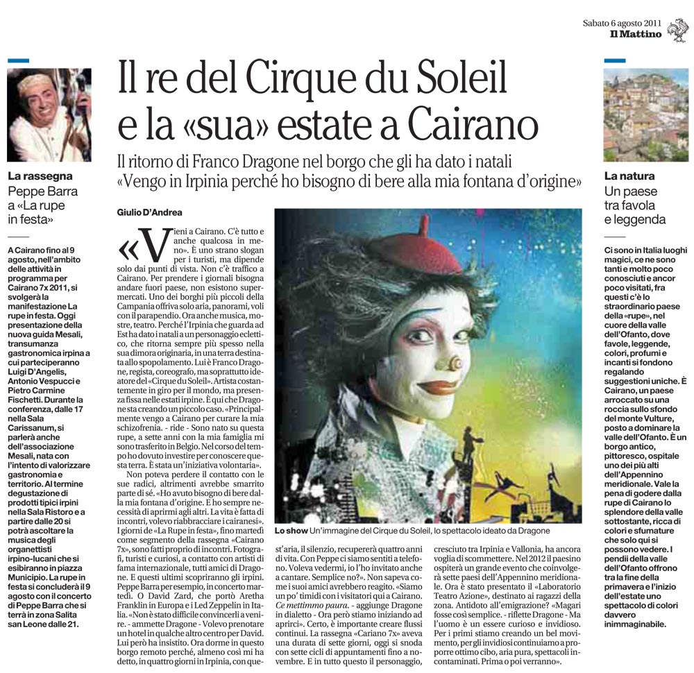 di GIOVANNI VENTRE _ _ _ Franco Dragone è un irpino che vive e lavora nel mondo. Organizza grandi eventi e spettacoli unici grazie alla capacità, alla fantasia ed alla caparbietà di un uomo delle terre di mezzo. Non lo conoscevo e devo dire che come spesso accade ci si fa una idea di un personaggio e poi puntualmente la stessa si reputa distorta e fuorviante. Venerdi sera a Cairano sono arrivato alle 20.00, ho incontrato con immenso piacere il carissimo e simpaticissimo Antonio Vespucci, Agostino della Gatta , Angelo Verderosa, Luca Sessa … davanti al famoso bar di Angiolino punto di ritrovo consacrato di chi sale a cairano. il grosso della banda era salita sulla rupe per ammirare il rosso tramonto irpino.