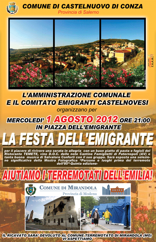 Cari lettori di Piccoli Paesi, con la comunità castelnovese vi invitiamo alla Festa dell’Emigrante di mercoledi 1° agosto 2012 in Piazza dell’Emigrante a Castelnuovo di Conza (sa). Faremo una raccolta fondi per i terremotati dell’Emila Romagna. Cordiali saluti, il sindaco arch. Francesco Custode