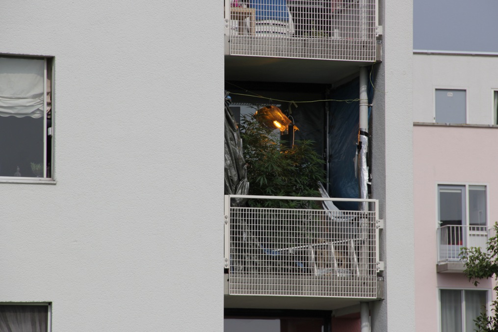 24 8 2012 Amsterdam. Coltivazione di canapa indiana sul terrazzino di un edificio residenziale. La lampada che accelera la produzione di canapa è alimentata dalla copertura fotovoltaica.