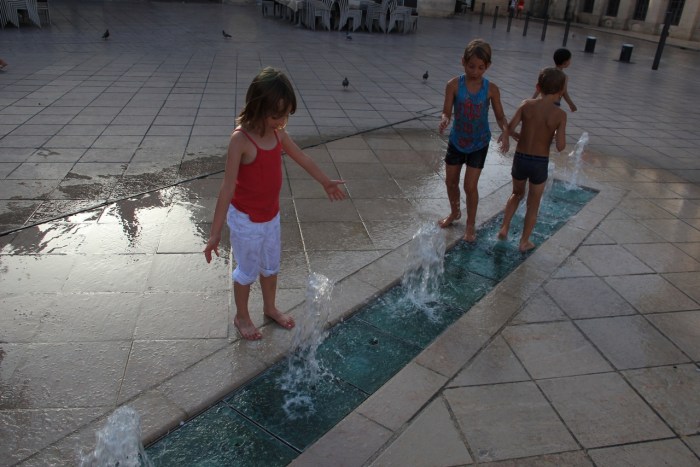 19 8 2012 DIJON _ grand tour europeo. Place de la Liberation. Fontana con bambini felici e bagnati.
