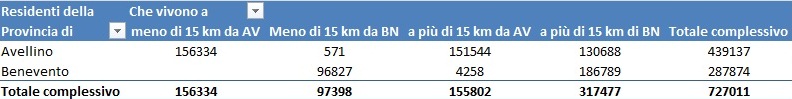 Le distanze le ho calcolate usando il sitoLa prima tabella pivot che ho costruito ci dice quanti abitanti di ciascuna provincia sono più vicini a Benevento o a Avellino.
