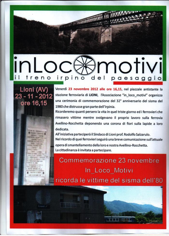 32 anni fa uno spaventoso terremoto distrusse gran parte della nostra Irpinia. Migliaia di persone perirono in quella triste giornata del 23 novembre del 1980. Interi paesi furono devastati. A distanza di tanti anni la memoria corre a quell’infausto evento e ai tanti progetti di sviluppo che hanno accompagnato l’opera di ricostruzione. Venerdì 23 novembre 2012 alle ore 16,15 nel piazzale antistante la stazione ferroviaria di LIONI, l’Associazione “in_loco_motivi” organizza una cerimonia di commemorazione di questa tragica data per noi irpini. Ricorderemo quanti persero la vita in quel triste giorno ed i ferrovieri che rimasero vittime mentre svolgevano il proprio lavoro alcuni dei quali in servizio sulla ferrovia Avellino-Rocchetta deponendo una corona di fiori sulla lapide a loro dedicata. All’iniziativa parteciperà il Sindaco di Lioni prof. Rodolfo Salzarulo. Nel ricordo di quei ferrovieri seguirà una breve riflessione sull’attuale opera di smantellamento della loro e nostra OFANTINA che sembra la perfetta descrizione fatta da Paolo Rumiz in un passaggio del suo libro “ l’Italia in seconda classe” dedicato alle ferrovie “minori”: “Il treno si ferma in stazioncine senza capostazione, senza biglietteria. Alcune sono murate, altre distrutte dai vandali. Sempre i banditi? No, la globalizzazione. Sono i rami secchi, potati dai governatori dei flussi. In burocratese si chiamano stazioni impresenziate, astuto eufemismo per mascherare lo smantellamento. La fine dei territori comincia così, col bar e la panetteria che chiude , poi con le stazioni del silenzio. Sento che comincia il viaggio in uno straordinario patrimonio dilapidato.” A tutto questo noi ci ribelliamo per impedire che ’alta Irpinia possa diventare un “deserto” senza speranza….