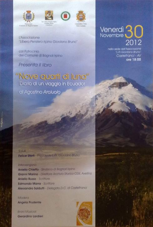 L’Associazione Libero Pensiero Irpino Giordano Bruno, l’Archivio Storico CGIL di Avellino, le Ceramiche d’arte Terra Leonum con il patrocinio del Comune di Bagnoli Irpino presentano il libro “Nove quarti di luna”, diario di un viaggio in Equador, di Agostino Arciuolo. L’appuntamento è per Venerdì 30 novembre 2012, alle ore 18.00, presso la sede dell’Associazione L.P.I. Giordano Bruno a Castelfranci (Av).