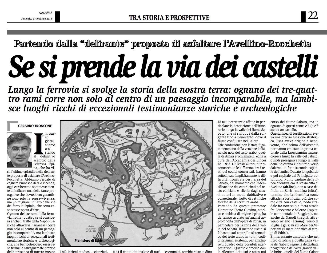 Due interessanti e utili contributi dell'Ing. Gerardo Troncone sulla Ferrovia Avellino-Rocchetta. Scrive l'Ing. Troncone : <<Salve, ho cercato di dare un piccolo contributo alla questione con due articoli sul Corriere, che allego, al quale ne seguiranno altri, con due obiettivi: 1) individuare le vere cause che hanno portato al disastro di oggi. 2) ipotizzare una diversa futura prospettiva per l'uso futuro delle ferrovie in irpinia. Con mia sorpresa ho visto che i miei articoli hanno innescato un interessante dibattito su internet, al quale suggerisco di partecipare. http://www.meetup.com/avellino1/messages/boards/thread/31349252 Saluti a tutti i lettori di Piccoli Paesi>>. per leggere gli articoli pubblicati sul Corriere dell'Irpinia, CLICCA sui 2 link seguenti : cor_22-23