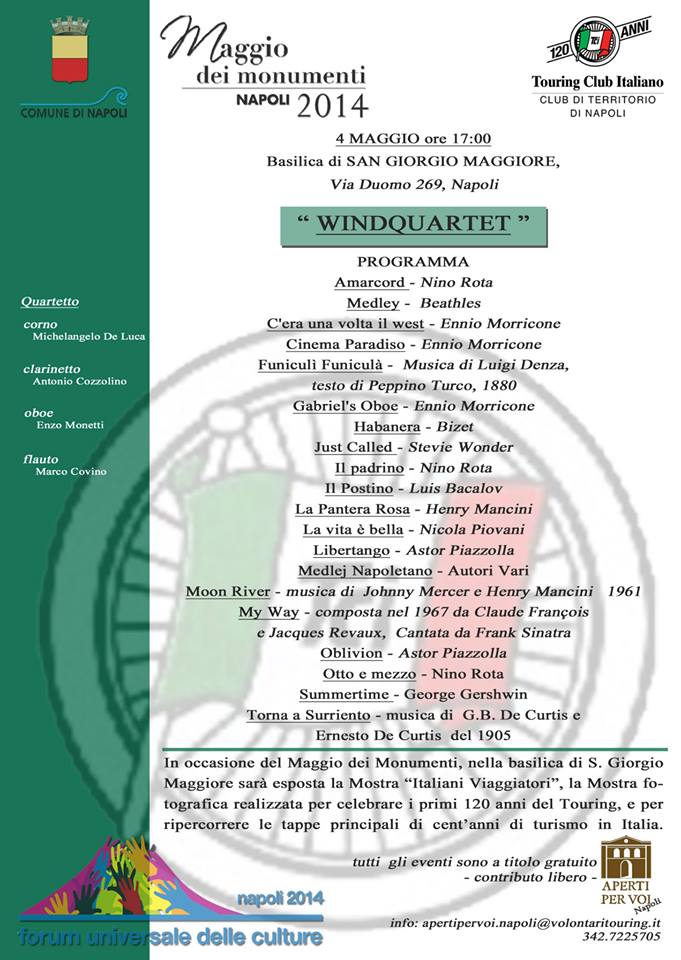 -Ore 16,30 Visita della Basilica di San Giorgio Maggiore (5). Saluto di Eduardo Amato, Touring Club Campania. Alle 17, in S. Giorgio Maggiore, apre il ciclo dei concerti con i Wind Quartet (vedi programma a fine pagina). Visita della Mostra “Italiani Viaggiatori” – che celebra i primi 120 anni del Touring Club Italiano e ripercorre le tappe principali di cent’anni di turismo in Italia. Nuovi soci potranno aderire al Touring Club Italiano a 39 €., la quota speciale riservata ai nuovi soci in occasione degli eventi per i 120 anni del Tci.