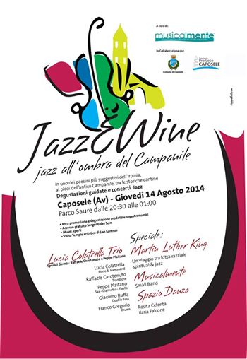 CAPOSELE – Torna a Caposele, giovedì 14 agosto, dalle 20,30 l’appuntamento con “Jazz&Wine all’Ombra del Campanile”. La rassegna, ideata dall’Associazione culturale “Musicalmente”, ed il patrocinio morale del Comune di Caposele, giunge alla sua seconda edizione, dopo il successo di pubblico e di critica dell’anno scorso che ha fatto diventare l’iniziativa una delle manifestazioni più attese del nostro territorio per gli appassionati di Jazz e non solo.