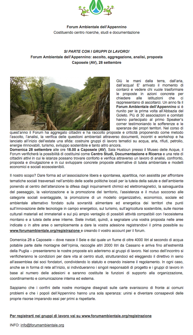 Forum Ambientale dell’Appennino a Caposele _ Convegno del 28 settembre 2014