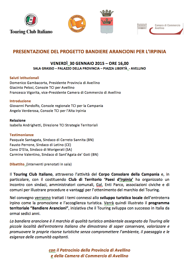 “Lo sviluppo turistico locale in Irpinia” / presentazione Progetto Bandiere Arancioni in programma per venerdì 30 gennaio 2015 ore 16 ad Avellino presso il Palazzo della Provincia, nella sala Grasso.