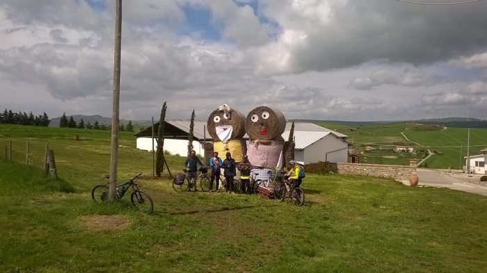 Viaggio in ambiente rurale: 9, 10 Aprile 2016 In compagnia di Alessio(BN), Luigi Pagani(SA), Raimondo, Luigi e Alessio di Ariano I. a ritmo lento per strade secondarie da Bisaccia (AV) a Muro Lucano (PZ) per promuovere il SI al referendum del 17 aprile. Nelle soste, Luigi, in forma propiziatoria ha suonato con la Tammorra il “ballo ‘r ‘e campagnuole” ballo della ritualità contadina. Attraversiamo il crinale del Formicoso, circondati da verdi e giovani distese di cereali libere di seguire il vento, raggiungiamo Calitri, dove, in un forno conosciamo il “il pane ré le femmene”: pane fatto con farina ricavata da cereali prodotti e lavorati da donne del posto. Attraversiamo il Fiume Ofanto e sulla sponda destra iniziamo a salire, lungo la SS7 via Appia, il Monte Serro la Serpa e a quota 665 m s.l.m. ci fermiamo a Sant’ Andrea di Conza nei pressi di una fontana-abbeveratoio (1805). Alcuni abitanti si incuriosiscono e si intrattengono alla vista del ns carrettino denominato “sciaraballo 2.0” con cui trasportiamo una vecchia damigiana, vuota, in cui è infilata una bandiera. Dopo che abbiamo spiegato le ragioni che ci hanno motivato ad intraprendere il viaggio, cioè difendere la ns tipicità da economie imposte, abbiamo appreso che a Sant’ Andrea di Conza è attiva una lodevole tradizione artigianale: ferro battuto, la cui fama ha travalicato i confini nazionali, la lavorazione della pietra, testimoniata dalla presenza di particolari e portali ricchi di elementi decorativi ed il ricamo.