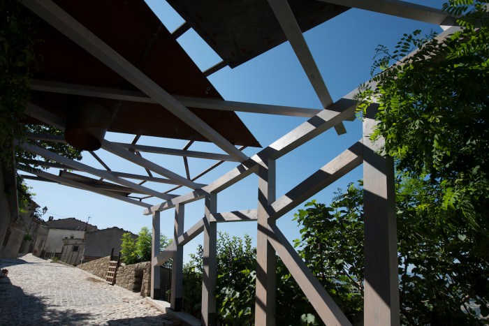 Master Lumsa, visita al BORGO BIOLOGICO (luglio 2017) » 1 Porta di Milone, pergolato in legno d’ingresso al borgo _ foto A. Bergamino