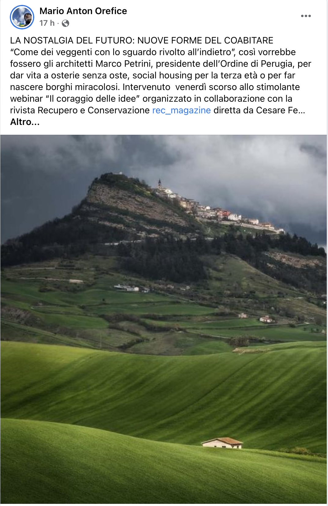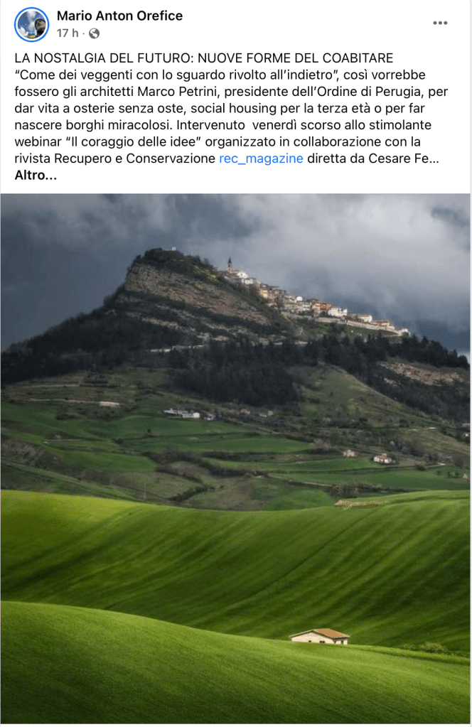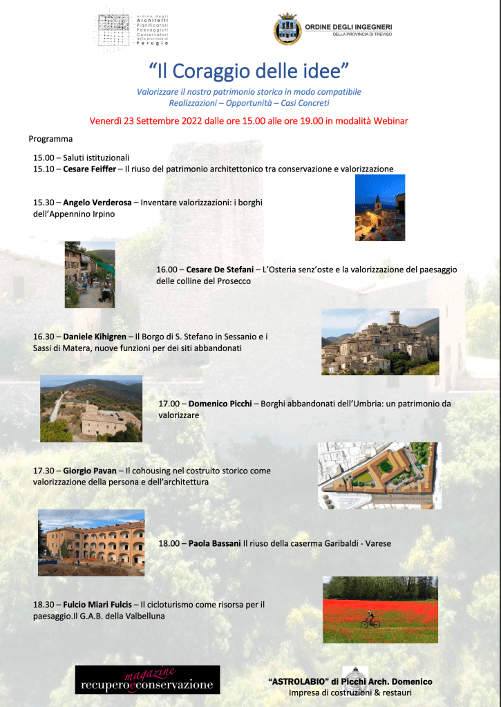 Per chi si interessa alle vicende del recupero (e rianimazione sociale) dei paesi, venerdì 23 sett. 2022, dalle 15,00 alle 19,00 c’è un seminario, promosso dall’Ordine Architetti di Perugia e dall’Ordine Ingegneri di Treviso, a cui partecipa l’arch. Angelo Verderosa portando testimonianze dei recuperi fatti finora in Irpinia.
