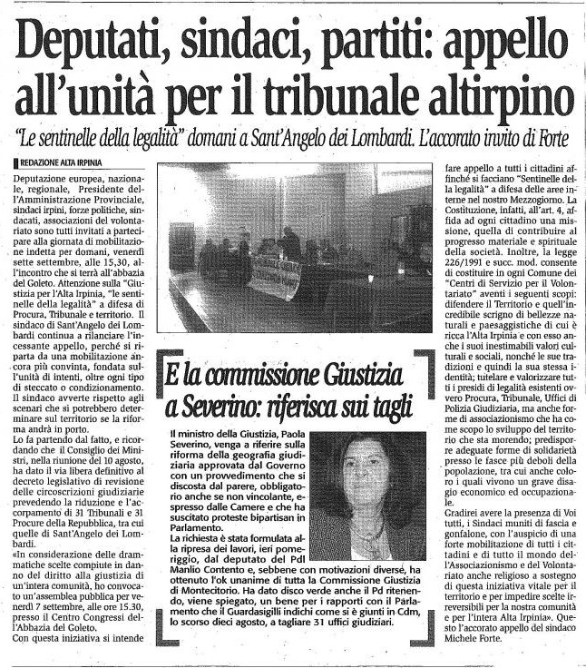 Il “”Centro Studi Di Diritto Societario e Fallimentare””, associazione di avvocati e commercialisti irpini, giunta al suo quinto anno di attività, ha promosso questa riflessione sul valore della giustizia, della sua amministrazione e del suo rapporto con il territorio con cui interagisce: nel nostro specifico l’Alta Irpinia. Qui il vivere quotidiano è permeato da un profondo senso di legalità, frutto anche della ultracentenaria presenza del Tribunale di Sant’Angelo dei Lombardi, che efficacemente coordinando le forze dell’ordine controlla i 1.200 Kmq. di territorio dei 28 comuni del suo circondario, contrastando efficacemente il tentativo di infiltrazione delle associazioni criminali provenienti dalle province limitrofe.