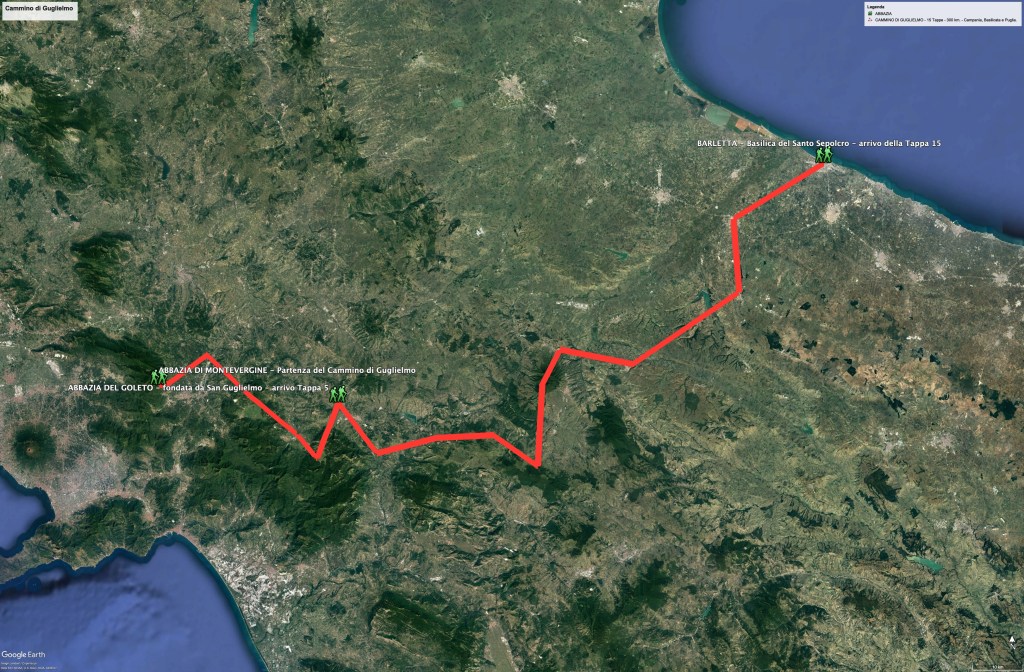 Il “Cammino” ripercorre le tappe del giovane pellegrino Guglielmo tra Campania, Basilicata e Puglia, fondando in Irpinia le abbazie di Montevergine e del Goleto e, in Basilicata, la Badia di Santa Maria di Pierno.