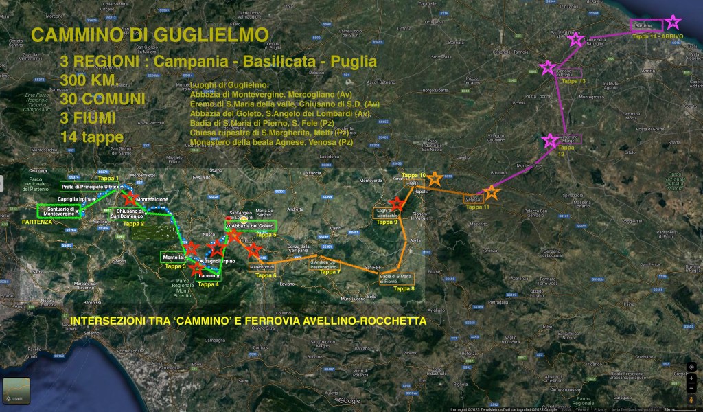 La cartografia, allegata al protocollo di intesa, prevede ben 15 tappe, per complessivi 300 km. attraversando i territori di 3 regioni (Campania, Basilicata e Puglia). Coinvolge oltre 30 comuni e attraversa 4 parchi: il Parco regionale del Partenio e il Parco regionale dei Monti Picentini, in Irpinia; il Parco del Vulture, in Basilicata, e il Parco naturale regionale del fiume Ofanto, in Puglia. Si snoda lungo i luoghi legati a Guglielmo, in primis, le abbazie fondate in Irpinia: l’Abbazia di Montevergine e l’Abbazia del Goleto. Quindi, i siti religiosi legati alle fondazioni guglielmine: l’Eremo di S. Maria della Valle (detto anche di S. Guglielmo) a Chiusano di San Domenico (AV), la Badia di S. Maria di Pierno presso San Fele (PZ) e il monastero di S. Bartolomeo a Melfi (PZ). E, da lì, seguendo l’Ofanto, fino a Melfi, e poi Minervino Murge, Canosa di Puglia e quindi a Barletta, dove era uno degli imbarchi per la Terra Santa, meta agognata dal giovane pellegrino.