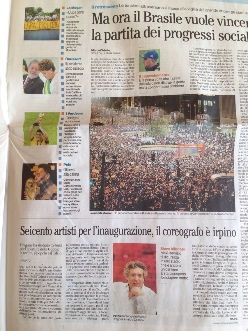 L’IRPINO FRANCO DRAGONE COREOGRAFO DELLA CERIMONIA DI APERTURA DEL MONDIALE DI CALCIO IN BRASILE. Dopo la cerimonia di apertura di ‘CAIRANO 7X‘, tenuta in Irpinia sabato scorso, adesso è la volta del Brasile.