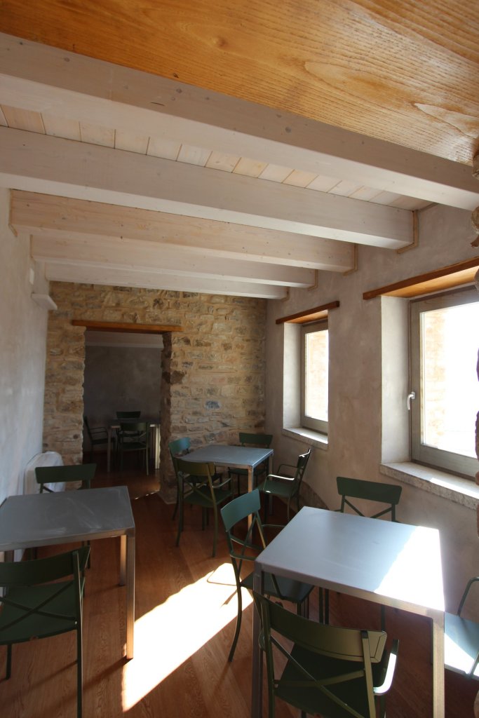 Dal punto di vista del comfort termico si è scelto di non intervenire con soluzioni invasive come un cappotto esterno che avrebbe comportato la regolarizzazione di tutte le superfici, ma si è preferito rivestire le pareti verso l’interno con uno strato isolante di 6 cm di intonaco a base di sughero che consente la conservazione delle murature nella loro morbidezza tattile e visiva. La climatizzazione estiva è affidata alle grosse masse termiche inerziali degli involucri stessi affiancata a ventilazione naturale ad opera di camini di ventilazione perfettamente integrati nelle geometrie delle strutture, mentre il riscaldamento invernale è garantito da stufe a biomassa. Grazie a queste efficaci soluzioni, che non necessitano di canalizzazioni e opere impattanti, gli alloggi sono tutti in classe energetica A3.