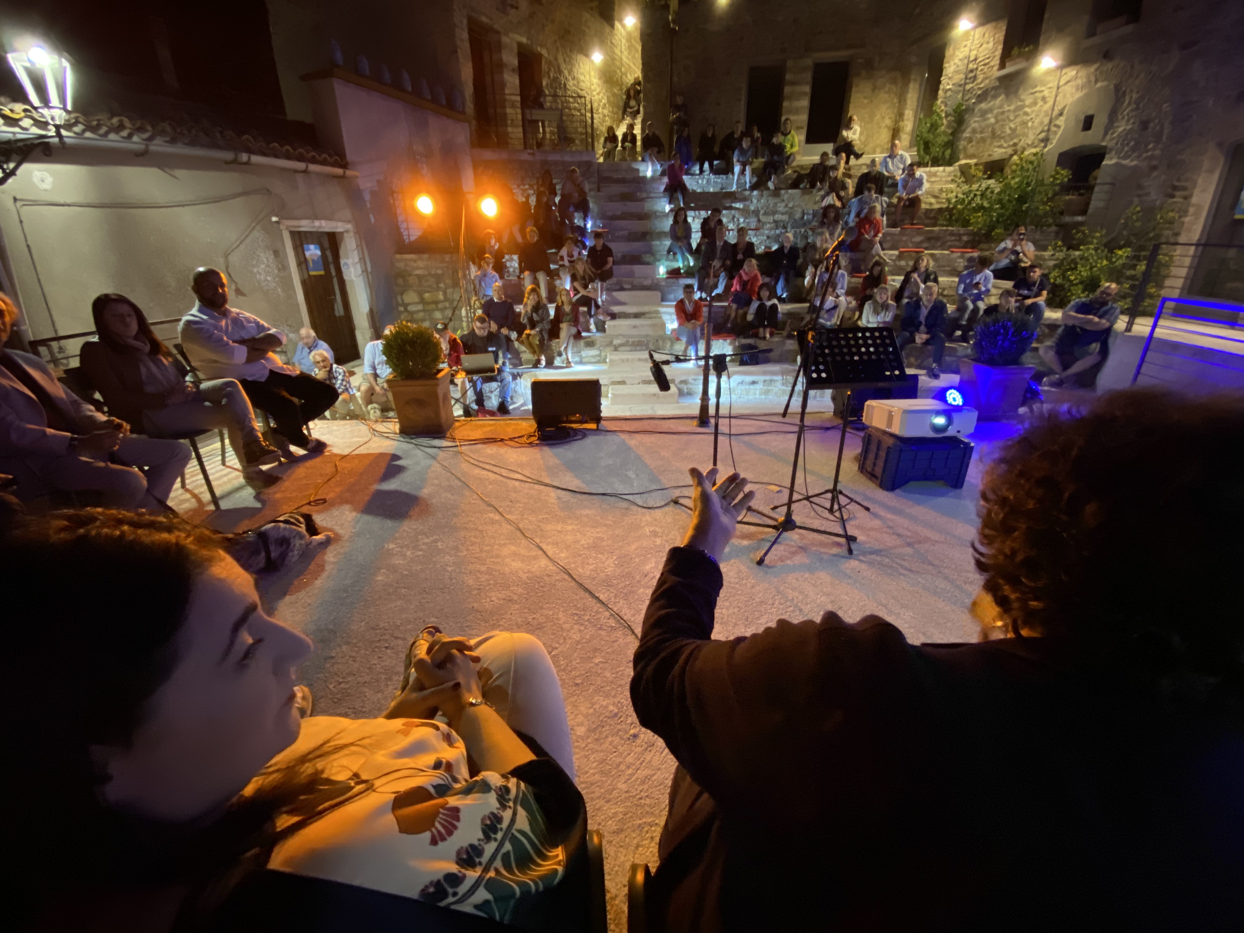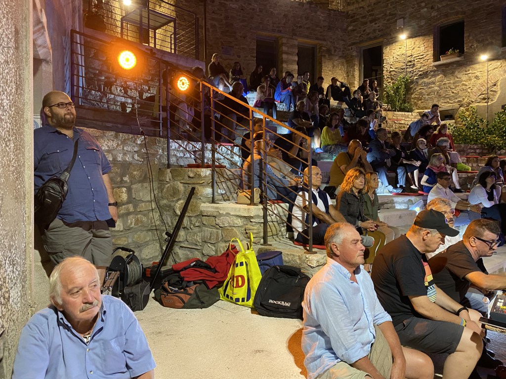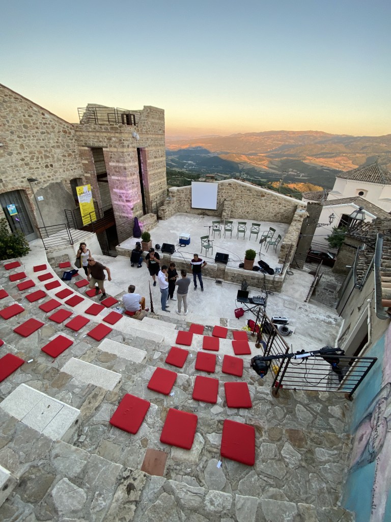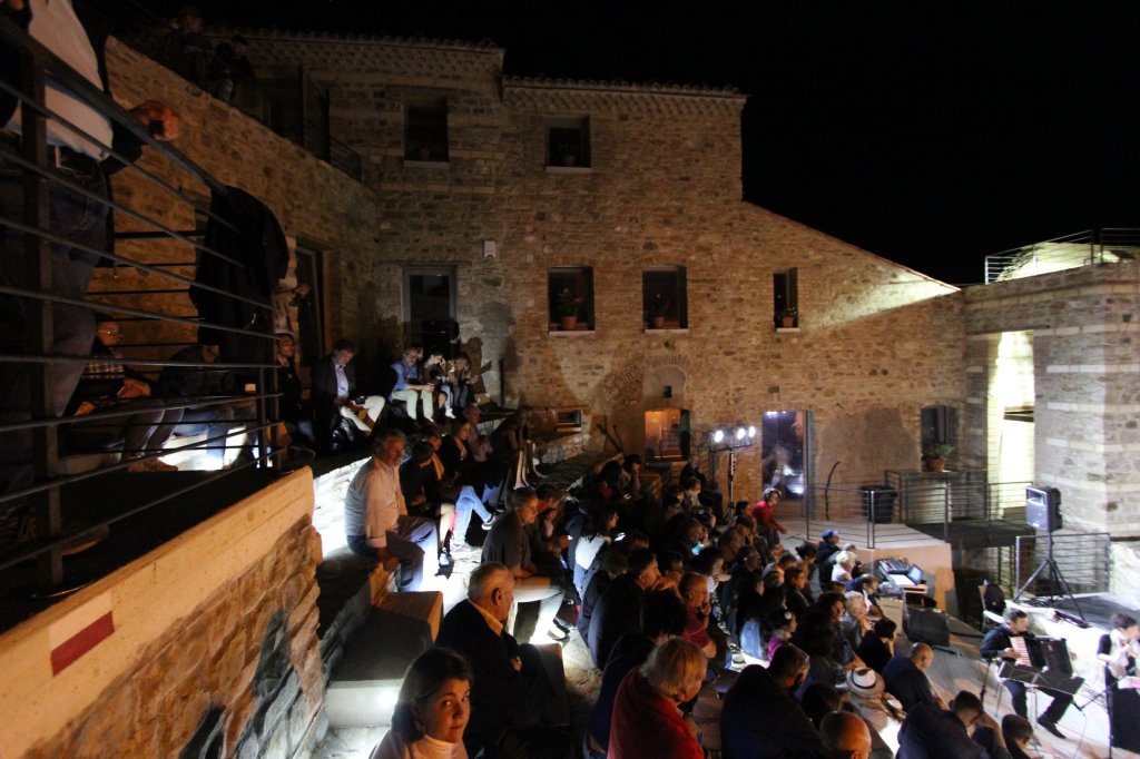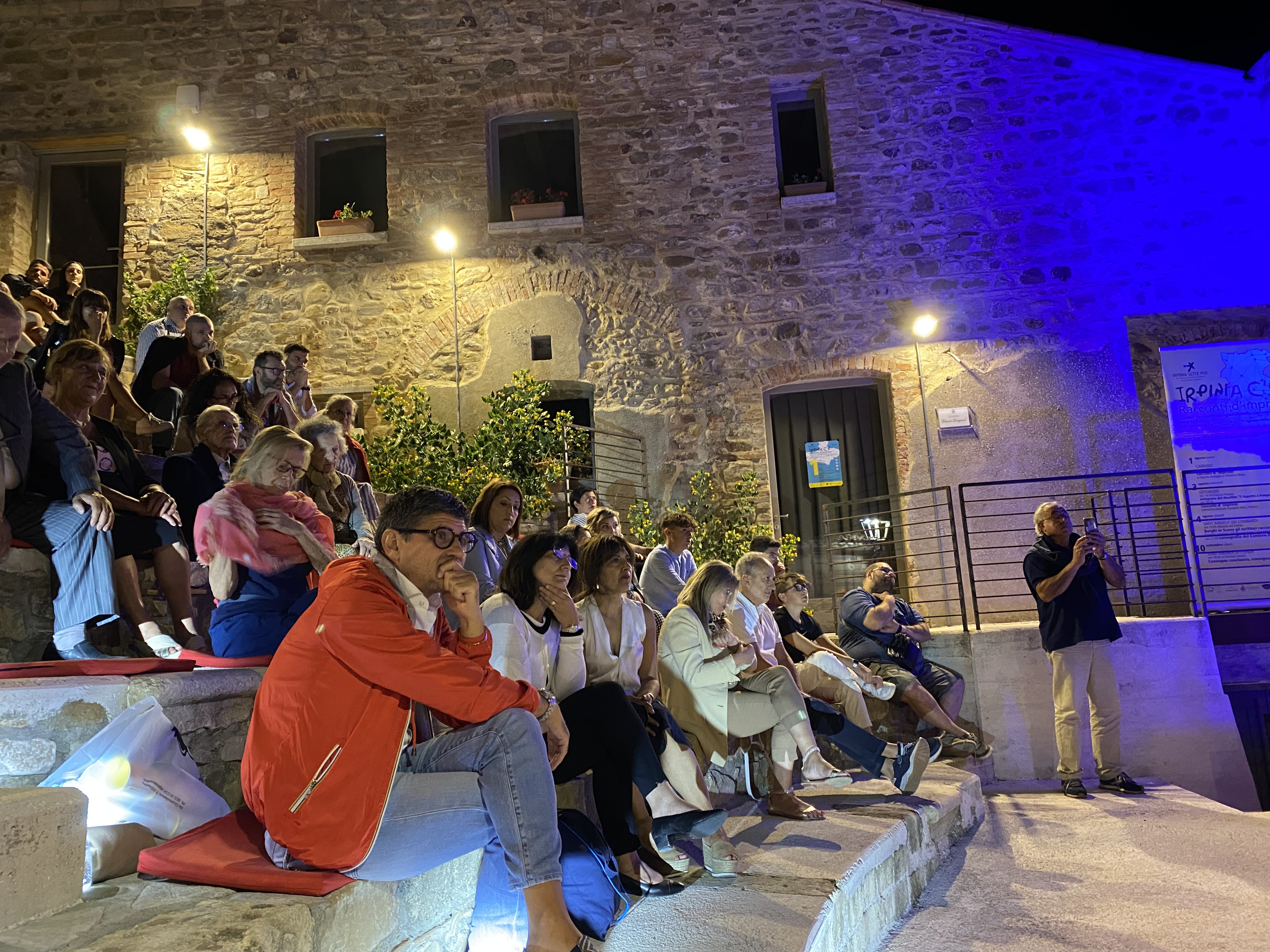 Mentre il maestro Spiniello accarezzava con i suoi pennelli uno spicchio di muro che costeggia gli antichissimi gradoni della platea del Teatro riportato alla luce, al quale si accede attraversando gli impervi vicoli del borgo, passando per il Museo delle relazioni felicitanti, appena dietro la Chiesa e la piazzetta, a fare da cornice allo spettacolo di note e suggestioni tanti gli avventori che si muovevano tra le residenze artistiche per studenti e docenti del Master in arti dello spettacolo, anch’esse frutto di una meticolosa opera di riqualificazione, con uno spazio dedicato alla mostra sul Cineasta e Partigiano cairanese, Michelangelo Frieri, curato dal professore Paolo Speranza.