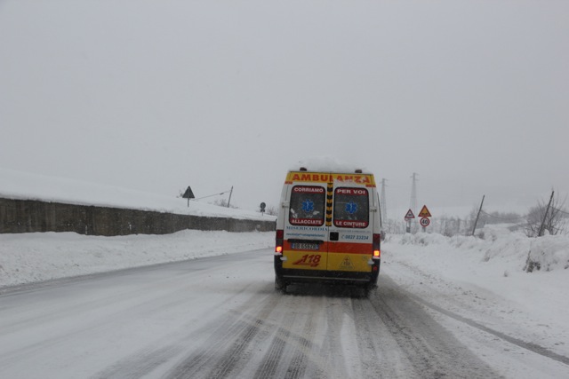 verso il pronto soccorso _ 7.2.2012 – ore 16 – dopo 4 giorni di disagi per neve in Alta Irpinia la viabilità -sia regionale (ANAS) che Provinciale (SP)- non è considerata un’emergenza; raggiungere l’ospedale zonale di S.Angelo dei Lombardi -unico presidio sanitario di montagna- è difficile; lo si vuole chiudere ma raggiungere Avellino o Ariano è ancora peggio (vedi altro fotoservizio); arrivati all’Ospedale rimaniamo di stucco …