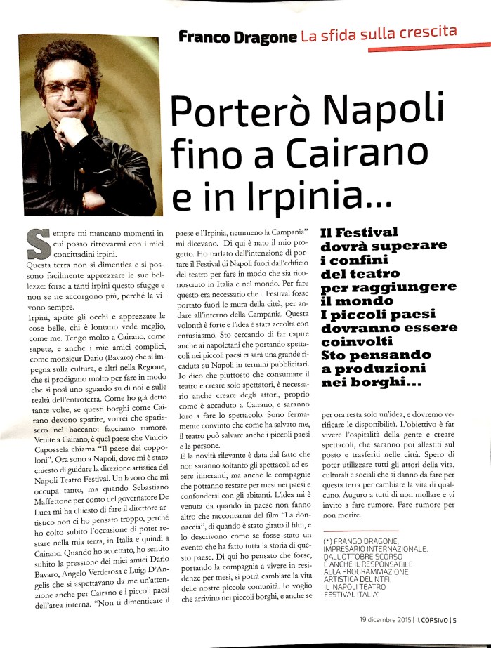 Cairano 7x 2012 si fa teatro; Franco Dragone, il cairanese più celebrato al mondo, ideatore del Cirque du Soleil e di tanti altri eventi e progetti che coltivano la magia e la bellezza della vita mettendola in scena, porta a Cairano, il paese delle sue radici, il primo Festival dei Corti Teatrali.