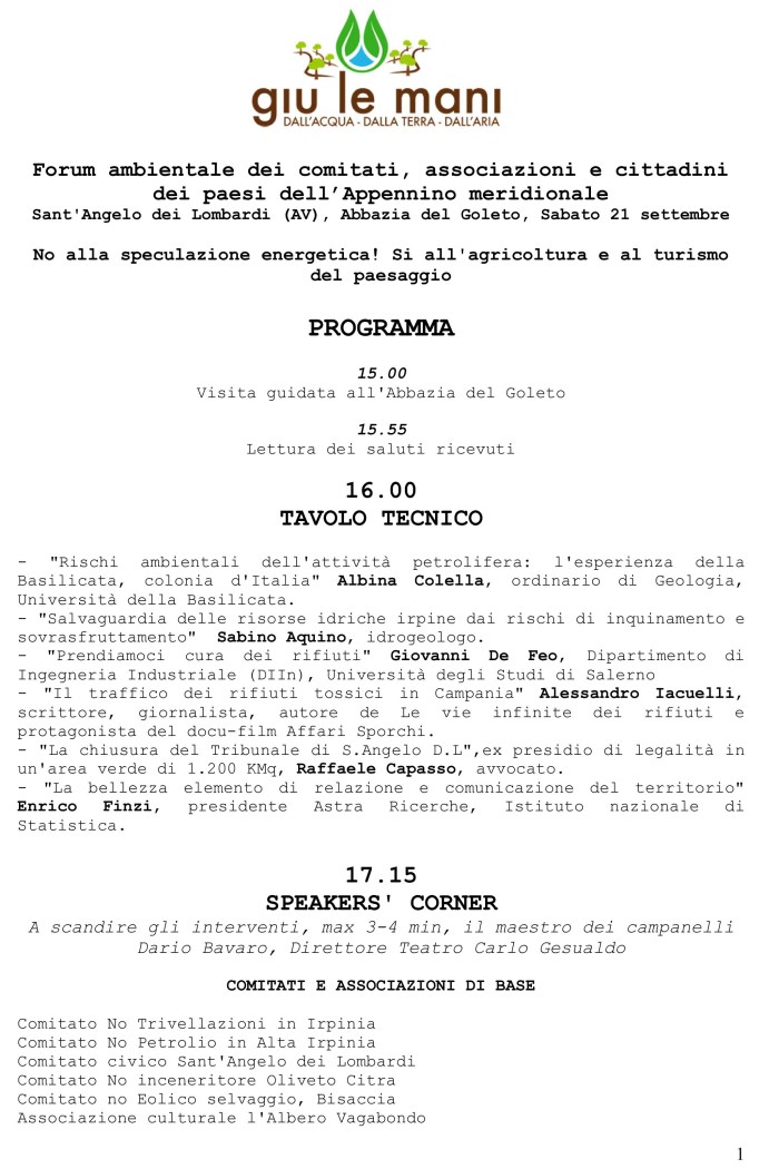 Il programma della densa giornata inizia alle 15.00 con la visita guidata dell’Abbazia fondata da San Guglielmo e continua alle 16.00 con un Tavolo tecnico al quale relazioneranno Albina Colella, Ordinario di Geologia, Università della Basilicata, sui rischi ambientali dell’attività petrolifera in Basilicata, Sabino Aquino, idrogeologo, sulla salvaguardia delle risorse idriche irpine dai rischi di inquinamento e sovrasfruttamento, Giovanni De Feo del Dipartimento di Ingegneria Industriale, Università degli Studi di Salerno sulla gestione del ciclo dei rifiuti, Alessandro Iacuelli, autore de “Le vie infinite dei rifiuti” e protagonista del docu-film “Affari Sporchi” sul traffico dei rifiuti tossici in Campania, Enrico Finzi, presidente Astra Ricerche, sulla bellezza come elemento di relazione e comunicazione del territorio e Raffaele Capasso, avvocato, sulla chiusura del Tribunale di S.Angelo D.L, ex presidio di legalità in un’area verde di oltre 1200 kmq.