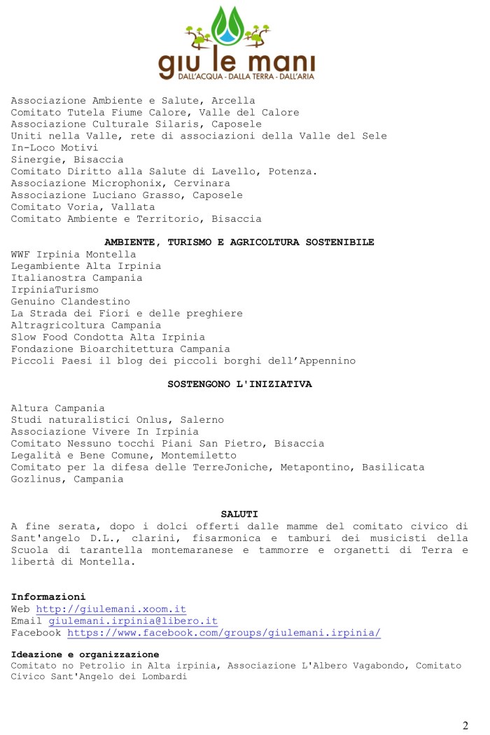 Comitato No Trivellazioni in Irpinia, Comitato No Petrolio in Alta Irpinia, Comitato civico Sant’Angelo dei Lombardi, Comitato No inceneritore Oliveto Citra, Comitato no Eolico selvaggio, Associazione culturale l’Albero Vagabondo, Associazione Ambiente e Salute, Comitato Tutela Fiume Calore, Associazione Culturale Silaris, Uniti nella Valle, In-Loco Motivi, Sinergie, Comitato Diritto alla Salute di Lavello, Associazione Microphonix, Associazione Luciano Grasso, Comitato Voria, Comitato Ambiente e Territorio