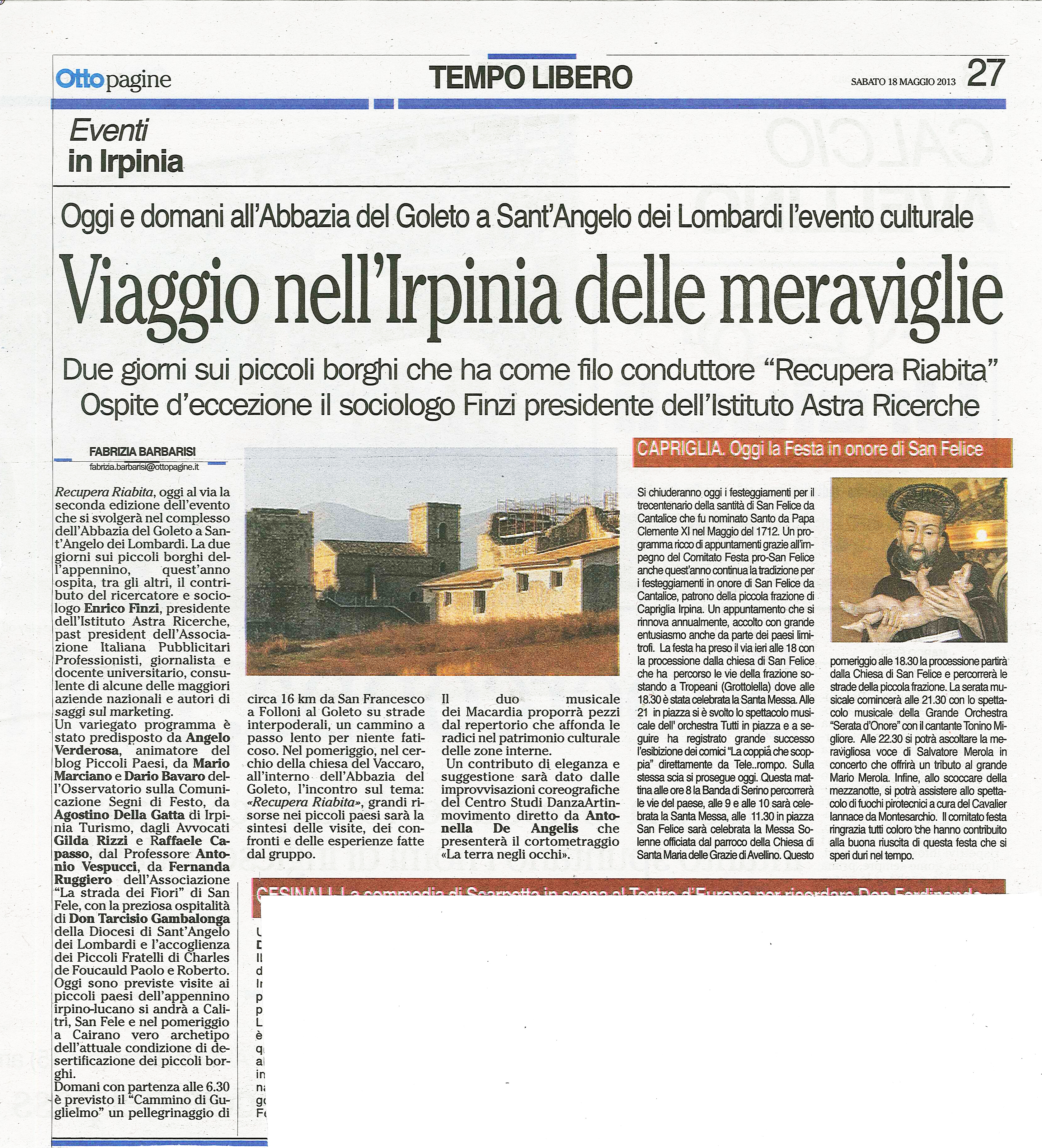 Per il CAMMINO, l’appuntamento è alle ore 6,30 di DOMENICA 19 MAGGIO davanti al portale d’ingresso di San Francesco a Folloni a Montella. Dopo 16 km. a piedi, arriveremo alle ore 11 circa, all’Abbazia del Goleto per la Messa domenicale. La partecipazione al Cammino mattutino è gratuita. Su questo blog ci sarà la conferma qualche giorno prima.