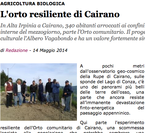 Cosa ci resta se non la terra e l’acqua, il sole e l’aria? In Alta Irpinia a Cairano, 340 abitanti arroccati ai confini della Lucania, nelle terre interne del mezzogiorno, parte l’Orto comunitario. Il progetto, ideato dall’associazione culturale l’Albero Vagabondo apre la stagione di Cairano 7X 2014, ed ha un valore fortemente simbolico e identitario.