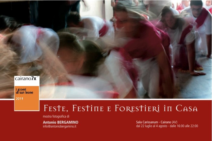 Il titolo, preso in prestito da un detto popolare, presenta un percorso fotografico realizzato in alcuni paesi dell’Irpinia ed è rappresentativo di eventi folcloristici e/o religiosi. Feste, piccole e grandi, molte delle quali ricche di tradizioni che riescono a coinvolgere gli spettatori (i forestieri) i quali sempre numerosi assistono a questi eventi. Antonio Bergamino, tecnico pubblicitario e fotografo, è un libero professionista che collabora con aziende e società di servizi ideando piani di comunicazione d’impresa in qualità di consulente.