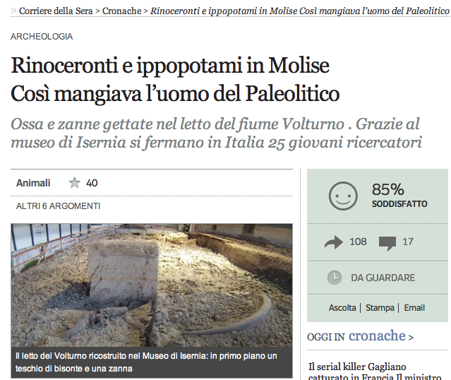 LEGGI L’ARTICOLO su corriere.it http://www.corriere.it/cronache/13_dicembre_20/rinoceronti-ippopotami-molise-cosi-mangiava-l-uomo-paleolitico-993d3e70-696d-11e3-95c3-b5f040bb6318.shtml