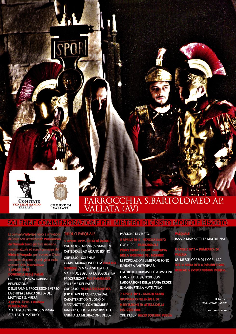 La Processione del Giovedì e Venerdì Santo, tradizionale e spettacolare rappresentazione religiosa, si svolge da tempo immemorabile nel comune di Vallata. La vivacità economica di Vallata e il suo costituire un nevralgico snodo stradale, determina lo stabilimento di una piccola ma fiorente comunità ebraica, specializzata nel commercio del bestiame, della lana e delle pelli, oltre che nelle consuete attività creditizie. A tale presenza si ricollega la scenografica rappresentazione, che dopo la conversione forzata del 1541 assunse il significato di una catechesi pubblica severa nei confronti degli antichi ebrei, ora divenuti cristiani novelli. Tali rappresentazioni iniziano il giovedì con la consueta lavanda dei piedi, la cattura con il tradimento di Giuda, il processo davanti a Pilato e la flagellazione. Si passa così al venerdì, dove viene ricordata la passione di Cristo con una commossa rievocazione, lontana dalle rappresentazioni sacre così diffuse nel medioevo, tramite i cosiddetti “Misteri”, costituiti dai simboli e tele settecentesche raffiguranti Gesù nei vari momenti della passione e i personaggi intervenuti nella stessa ,con frasi del racconto evangelico di San Giovanni, oltre a stendardi, insegne romane e altri simboli sacri. Animano la processione due numerosi “Squadroni”, uno dei piccoli e uno dei grandi, formati da giovani del paese con armatura romana al completo, preceduti, il piccolo squadrone, dall’ Aquila latina con due alabardieri e dalla guida e, il grande, da Cesare Imperatore con Lictores, capo squadrone e Pilato. Partecipano alla Processione circa 150 figuranti. Il passo di tutti è cadenzato dal ritmo di un suono caratteristico di tromba e tamburo, che contribuisce a creare un ambiente di commossa riflessione sul grande mistero di dolore di Cristo. Tale meditazione è ulteriormente sollecitata da alcuni cantori sparsi lungo la processione che intonano in un motivo popolare caratteristico, i versetti sacri del Metastasio sulla passione, tradotti in dialetto irpino. Chiudono la processione il feretro del Cristo morto circondato dai medici del paese e l’Addolorata circondata da bambine con bandierine listate a lutto.
