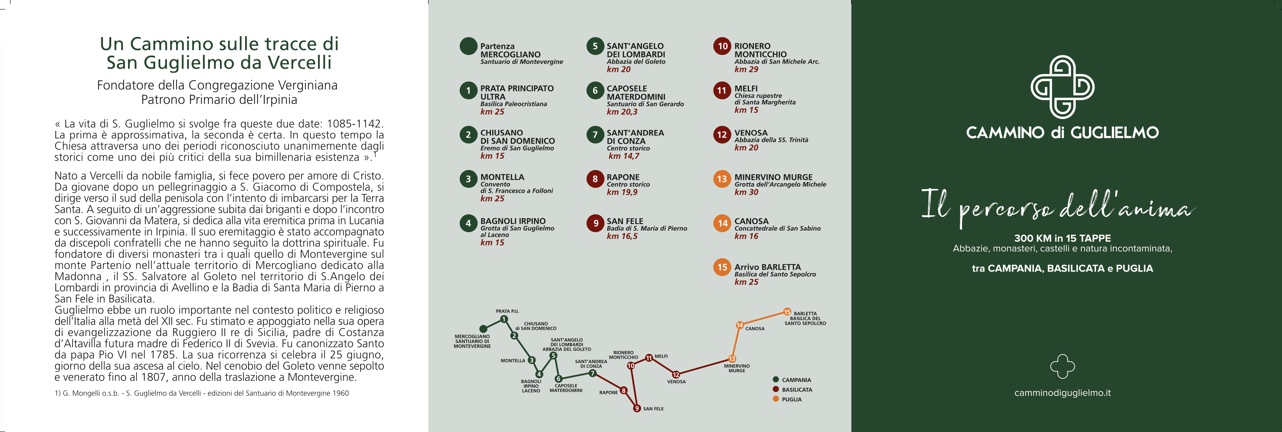 La cartografia, allegata al protocollo di intesa, prevede ben 15 tappe, per complessivi 300 km. attraversando i territori di 3 regioni (Campania, Basilicata e Puglia). Coinvolge oltre 30 comuni e attraversa 4 parchi: il Parco regionale del Partenio e il Parco regionale dei Monti Picentini, in Irpinia; il Parco del Vulture, in Basilicata, e il Parco naturale regionale del fiume Ofanto, in Puglia. Si snoda lungo i luoghi legati a Guglielmo, in primis, le abbazie fondate in Irpinia: l’Abbazia di Montevergine e l’Abbazia del Goleto. Quindi, i siti religiosi legati alle fondazioni guglielmine: l’Eremo di S. Maria della Valle (detto anche di S. Guglielmo) a Chiusano di San Domenico (AV), la Badia di S. Maria di Pierno presso San Fele (PZ) e il monastero di S. Bartolomeo a Melfi (PZ). E, da lì, seguendo l’Ofanto, fino a Melfi, e poi Minervino Murge, Canosa di Puglia e quindi a Barletta, dove era uno degli imbarchi per la Terra Santa, meta agognata dal giovane pellegrino.