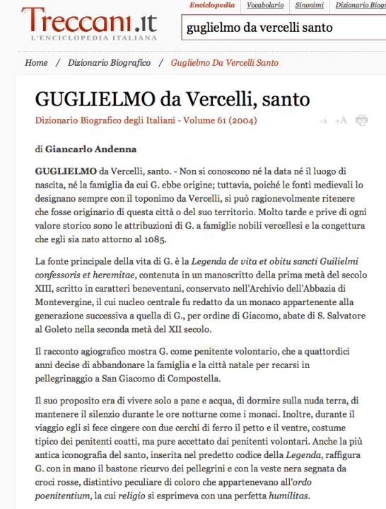 Una voce autorevole e molto approfondita sulla vita di Guglielmo da Vercelli (1085-1142); patrono principale dell’Irpinia dal 1942. (per leggere l’intero testo, clicca sul seguente LINK) http://www.treccani.it/enciclopedia/guglielmo-da-vercelli-santo_(Dizionario-Biografico)/