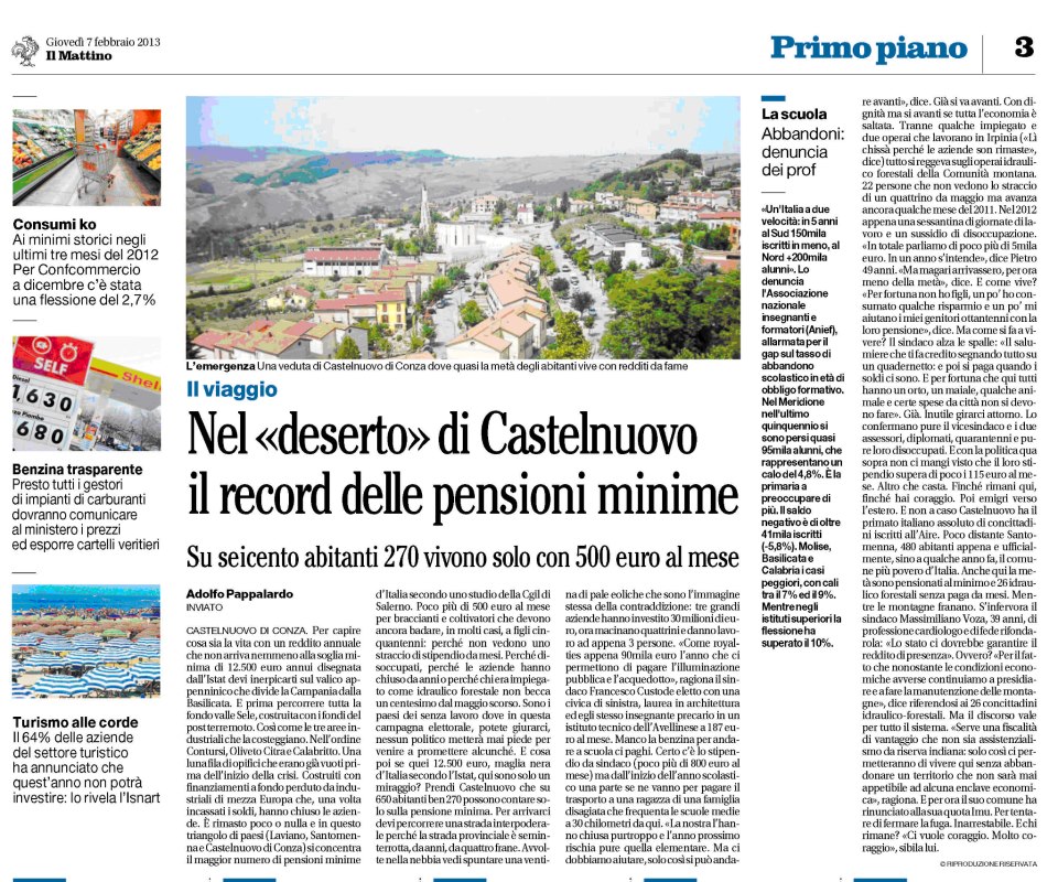 Ringrazio il giornalista Adolfo Pappalardo che inviato del Mattino, ho incontrato mercoledì 6 febbraio in una serata piovosa a Castelnuovo e che mi ha intervistato, in quanto i dati Istat riportano Castelnuovo con il più alto rapporto tra pensionati minimi e residenti.