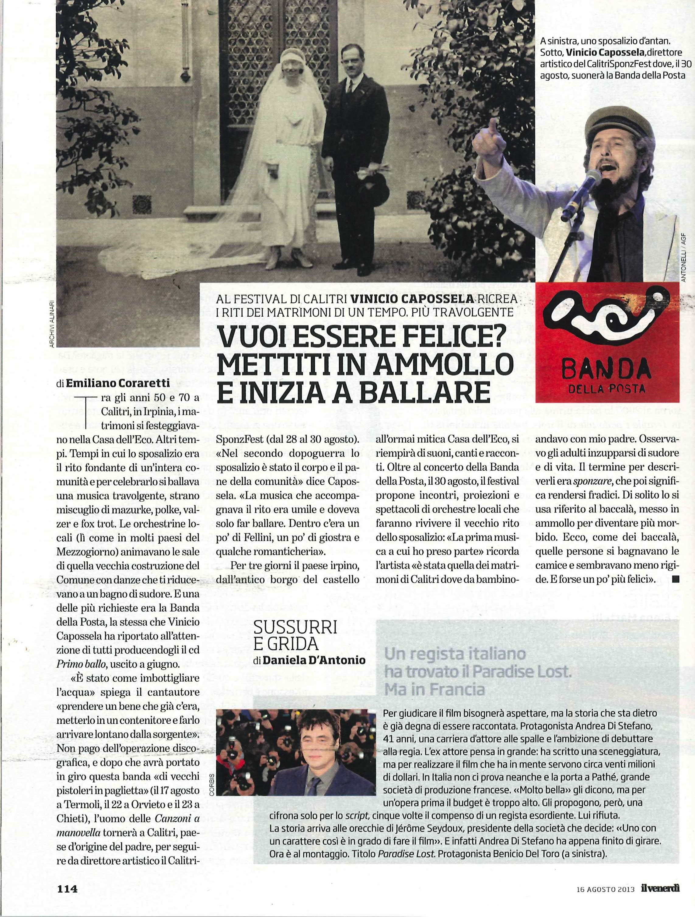 200 artisti, 100 volontari al lavoro, sold out della ospitalità diffusa a Calitri e nei paesi circostanti, 350 lenzuola dipinte ed appese lungo le strade del paese, 5 quintali di “cannazze”, 200 forme di pane, più di mille “vraciole” servite agli stand gastronomici matrimoniali del primo festival dello sposalizio ideato e diretto da Vinicio Capossela. Sono da record i numeri di questa prova generale dello Sponz Fest che si è rivelata un riuscitissimo numero zero.